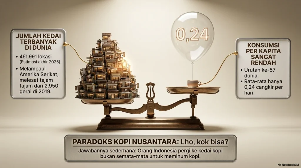 Tapi ada satu data yang mungkin membuat kita mengernyitkan dahi. Meski Indonesia adalah negara dengan kedai kopi terbanyak di dunia, rata-rata orang Indonesia hanya mengonsumsi sekitar 0,24 cangkir kopi per hari, menempatkan Indonesia di posisi ke-57 dunia dalam hal konsumsi kopi per kapita.