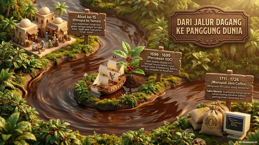 Cerita kopi di sini, ironisnya, tidak dimulai dari latte art atau menu musiman, melainkan dari jalur dagang dan perpindahan tanaman. Ensiklopedia Britannica mencatat bahwa tanaman kopi liar berasal dari kawasan Ethiopia, lalu dibudidayakan di Yaman sekitar abad ke-15. Dari situ kopi kemudian melahirkan rumah-rumah kopi yang berfungsi sebagai tempat bertemu, bercakap, bermain, berdebat, dan bertukar kabar. Jadi sejak awal, kopi secara global memang bukan sekadar minuman; ia selalu punya sisi sosial. Ini penting karena fungsi sosial itulah yang nanti terasa sangat cocok ketika kopi berakar di Indonesia.