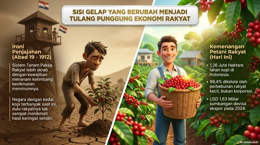 Timeline Museum Nasional juga mencatat pukulan besar lain: wabah karat daun pada 1875 merusak banyak kebun kopi di Jawa, dan pada 1900 robusta mulai dibudidayakan di Jawa, lalu menyebar ke wilayah lain. Artinya, dari awal kopi di Indonesia bukan cuma soal rasa, tetapi juga soal kerja paksa, adaptasi ekologis, dan penyusunan ulang ekonomi kolonial. Sesudah kemerdekaan, pusat gravitasinya berubah pelan-pelan dari kebun besar ke petani rakyat. Data Kementerian Pertanian menunjukkan bahwa pada 2022 produksi kopi Indonesia mencapai 789,97 ribu ton dari sekitar 1,26 juta hektare, dan 99,40 persen lahannya diusahakan oleh perkebunan rakyat. Laporan USDA untuk 2025/26 menambahkan bahwa luas areal kopi diperkirakan tetap sekitar 1,2 juta hektare dan kebun kecil 1–2 hektare masih menyumbang 98 persen area tanam; sekitar 80–90 persen total produksi adalah robusta, sementara Sumatra menyumbang kira-kira 70–75 persen green bean nasional. Pada 2024, menurut analisis perdagangan kopi pemerintah, ekspor kopi menyumbang devisa sekitar USD 1,63 miliar, dan produksi 2024 diperkirakan naik ke 807.578 ton. Jadi, kopi tetap barang global, tetapi tulangnya adalah petani kecil domestik.