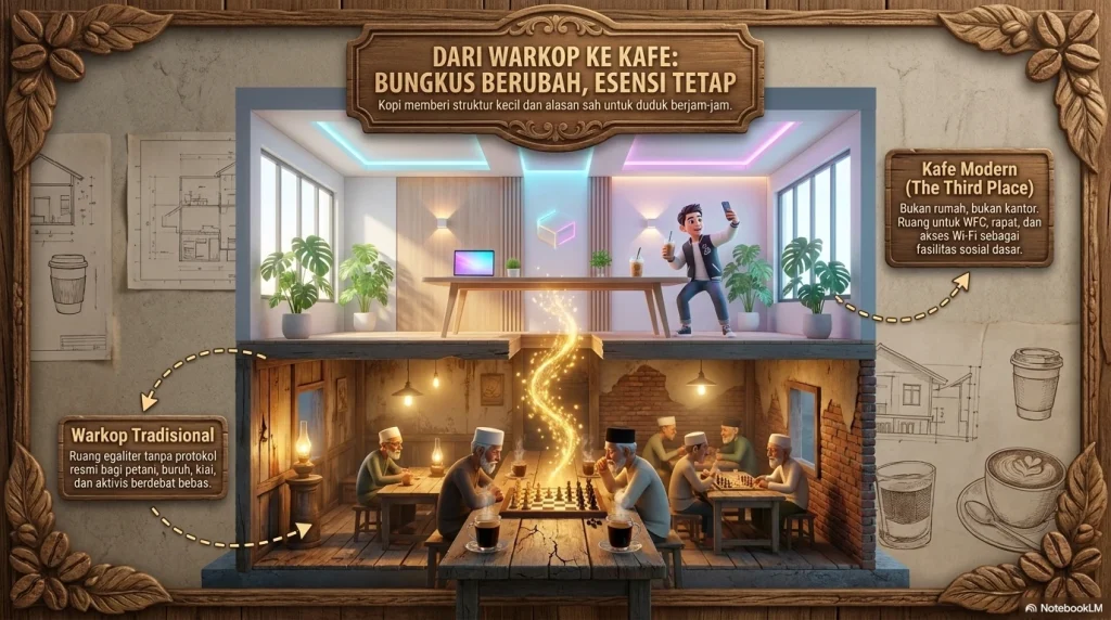 Di sinilah korelasi yang paling menarik antara kopi dan tradisi Indonesia. Kopi tidak datang ke ruang kosong. Ia masuk ke masyarakat yang sudah lama punya tradisi mampir, duduk, ngobrol, menunggu, dan membangun relasi lewat meja makan atau meja warung. Ketika kopi naik kelas menjadi komoditas gaya hidup, ia tidak serta-merta memutus hubungan dengan tradisi itu. Sebaliknya, ia menumpang pada kebiasaan lama lalu mengganti bungkusnya. Karena itu kita bisa melihat satu garis lurus dari warung kopi tradisional ke kafe modern, dari obrolan politik ke kerja laptop, dari forum warga ke rapat startup. Yang berubah terutama adalah estetika, peralatan, dan kanal pemesanannya; fungsi sosial dasarnya relatif tetap.