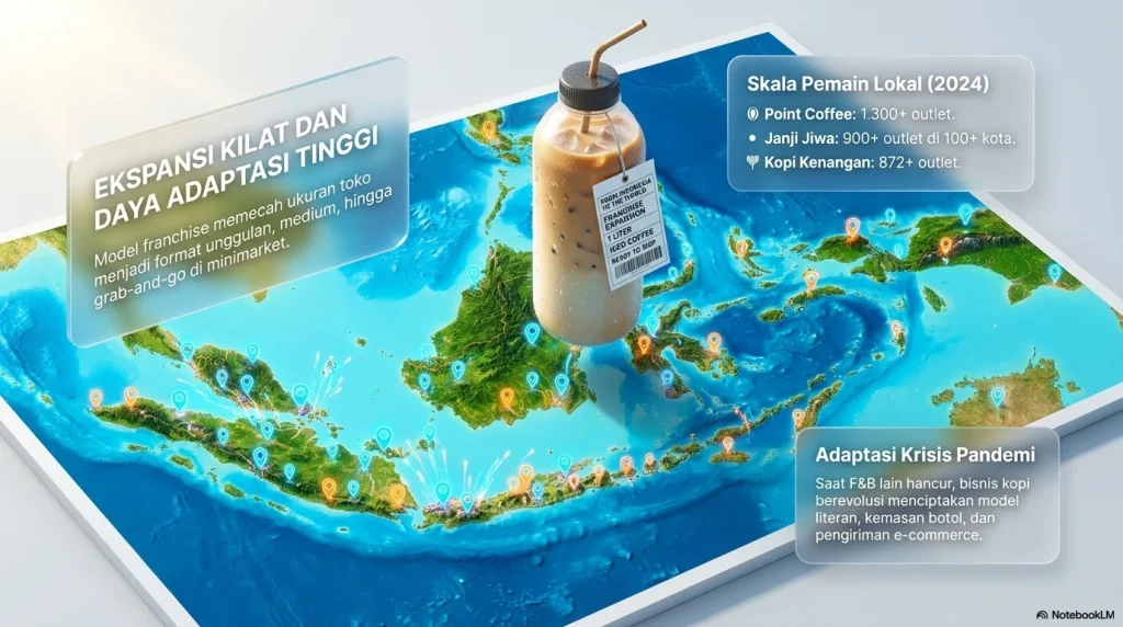 Soal pertumbuhan modernnya, titik penting yang sering dikutip datang dari riset Toffin. Pada Agustus 2019, jumlah kedai kopi di Indonesia yang terdata mencapai lebih dari 2.950 gerai, naik hampir tiga kali lipat dari sekitar 1.000 gerai pada 2016. Toffin juga memberi catatan penting: angka itu belum menghitung seluruh kedai independen modern maupun tradisional di berbagai daerah, sehingga jumlah riil kemungkinan lebih besar. Yang menarik, pada saat pandemi menghantam, model bisnis kopi tidak lenyap; ia justru beradaptasi lewat berbagai model pemesanan: literan, botolan, e-commerce, dan pesan-antar. Jadi yang tumbuh pada akhirnya bukan hanya jumlah gerai, tetapi juga kecakapan pelaku usaha kopi untuk berganti bentuk sesuai situasi dan kondisi. Sesudah pandemi, ekspansi itu semakin kelihatan. Laporan USDA tentang industri foodservice Indonesia pada 2025 menyebut jumlah jaringan coffee shop terus meningkat sejak 2018, bahkan tetap bertambah selama pandemi. Laporan yang sama mencatat Kopi Kenangan telah menembus lebih dari 872 outlet pada 2024, sedangkan laman perusahaan menampilkan 868 outlet di 64 kota; Jiwa Group dengan kedai Janji Jiwa, menyebut jaringannya sudah memiliki hampir 900+ outlet di 100+ kota; dan Indomaret menyatakan Point Coffee saat ini sudah memiliki lebih dari 1.300 outlet di seluruh Indonesia. Sementara itu, prospektus IPO Fore Coffee menunjukkan perusahaan ini mengoperasikan tiga jenis outlet: flagship (toko besar yang berfungsi sebagai social hub atau pusat berkumpul), medium, dan satellite, serta berencana membuka sekitar 140 outlet baru pada 2025–2026. Ini menjelaskan kenapa kopi terasa “menjamur”: format bisnisnya dipecah menjadi ukuran yang cocok untuk mal, gedung kantor, minimarket, kota tier dua, kota tier tiga, bahkan transaksi online.