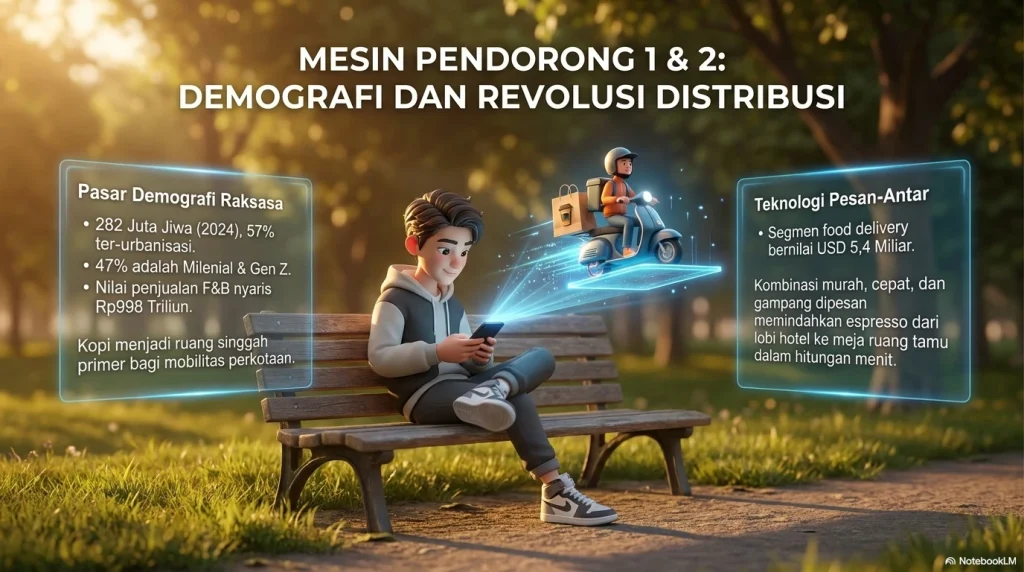 Ada beberapa mesin pendorong yang bekerja bersamaan. Pertama, struktur demografis dan ekonomi. USDA mencatat Indonesia memiliki populasi 282 juta jiwa pada 2024, dengan urbanisasi sekitar 57 persen dan porsi milenial serta Gen Z sekitar 47 persen. Di saat yang sama, nilai sektor hotel, restoran, dan institusi mencapai sekitar USD 29 miliar pada 2024, sementara BPS mencatat nilai penjualan usaha penyediaan makanan dan minuman pada 2023 sudah mencapai Rp998,37 triliun dengan 9,80 juta tenaga kerja. Di atas kertas, ini berarti ada pasar besar, tenaga kerja besar, mobilitas perkotaan besar, dan budaya makan-minum di luar rumah yang memang kuat. Ketika orang kota makin butuh ruang singgah, kopi datang dengan produk yang murah relatif, mudah dimodifikasi, dan bisa dijual hampir di mana saja.