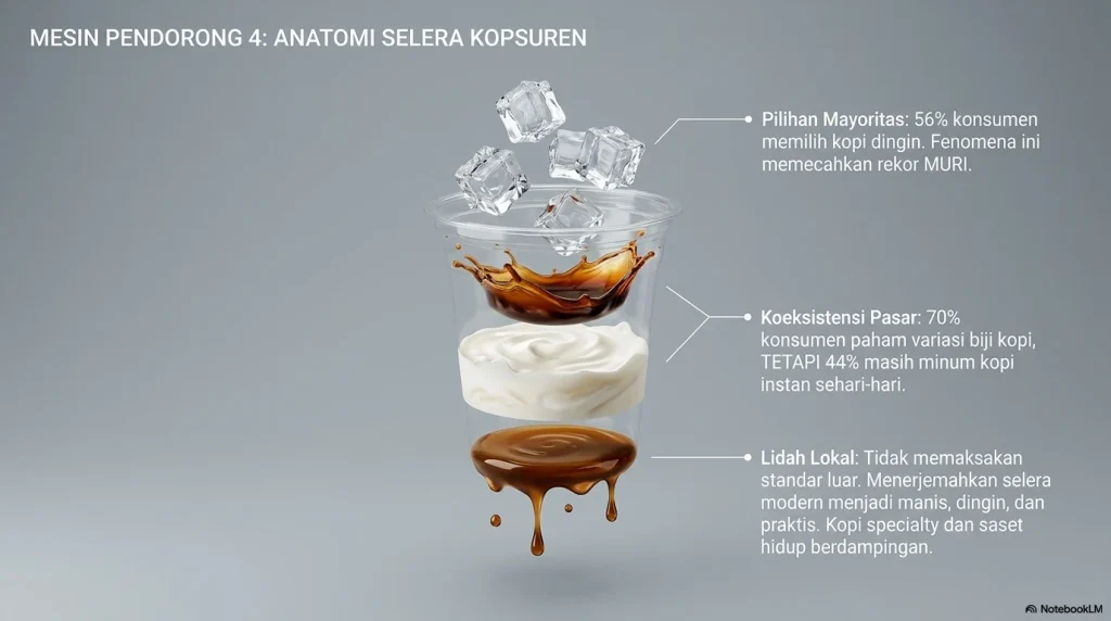 Di sisi lain, masuknya bahasa kopi global juga membuat konsumen Indonesia merasa makin akrab dengan dunia perkopian modern. Specialty Coffee Association mendefinisikan specialty coffee sebagai kopi atau pengalaman kopi yang dikenali karena atribut khasnya sehingga memiliki nilai lebih tinggi di pasar. Definisi ini terdengar teknis, tetapi dampaknya nyata: ia mendorong percakapan tentang mutu, asal, proses, keberlanjutan, dan pengalaman. Ketika Jakarta menjadi tuan rumah World of Coffee 2025, pameran global pertama jenis itu di Indonesia, pesannya menjadi lebih jelas: Indonesia tidak lagi dipandang hanya sebagai sumber bahan mentah, melainkan juga sebagai pasar konsumen penting dan panggung budaya kopi spesial di Asia. Namun yang membuat semua itu benar-benar “masuk” ke budaya Indonesia adalah adaptasinya terhadap lidah dan kebiasaan lokal. Snapcart menunjukkan banyak konsumen Indonesia menyukai kopi susu, kopi manis, dan kopi dingin; Toffin juga menyoroti betapa kuatnya daya tarik kopi susu di kalangan Gen Y dan Z. Itu sebabnya produk yang meledak bukan espresso murni yang pahit dan kaku, melainkan es kopi susu, gula aren, varian literan, RTD atau ready-to-drink, kopi siap minum, serta menu yang gampang dibeli dengan spontan. Dengan kata lain, industri kopi yang sukses di Indonesia bukan yang paling “asing”, melainkan yang paling pandai menerjemahkan selera modern ke kebiasaan lokal: manis, dingin, praktis, bisa dibawa, bisa difoto, tetap enak untuk nongkrong lama.