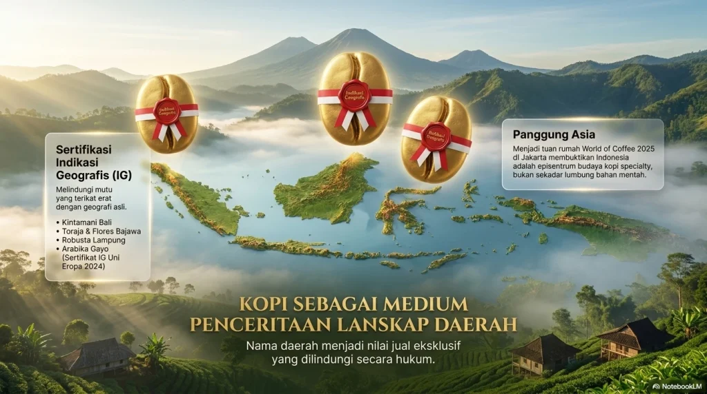 Hubungan itu juga terlihat pada cara kopi menempel pada identitas daerah. Listing resmi Direktorat Jenderal Kekayaan Intelektual menampilkan banyak kopi berindikasi geografis, yakni perlindungan hukum untuk produk yang mutunya terkait kuat dengan wilayah asal, seperti Kopi Arabika Gayo, Kopi Arabika Kintamani Bali, Kopi Arabika Flores Bajawa, Kopi Arabika Kalosi Enrekang, Kopi Arabika Java Preanger, Kopi Arabika Toraja, dan Kopi Robusta Lampung. Pada 2024, DJKI juga mengumumkan bahwa Kopi Arabika Gayo memperoleh sertifikat indikasi geografis Uni Eropa. Ini penting bukan cuma untuk ekspor, tetapi juga untuk imajinasi budaya: kopi tidak lagi dijual sebagai cairan berkafein semata, melainkan sebagai cerita tempat, lanskap, petani, dan rasa lokal. Nama daerah menjadi bagian dari nilai jual.