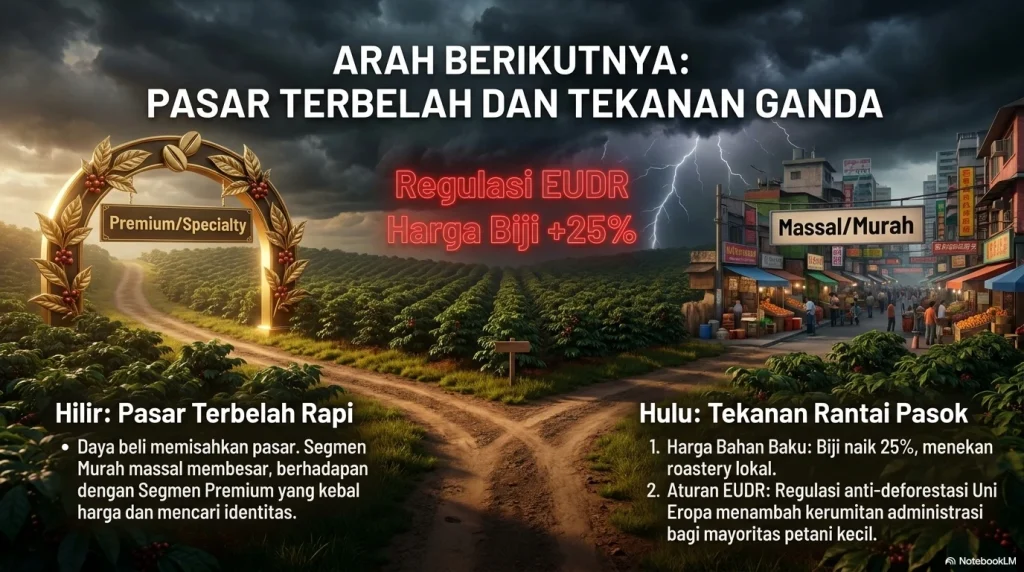 Dari sisi hulu, tantangannya juga makin serius. USDA mencatat harga biji naik 25 persen dari November 2024 ke Maret 2025, sementara implementasi EUDR, EU Deforestation Regulation, aturan Uni Eropa yang menuntut pembuktian bahwa komoditas tidak terkait deforestasi, diperkirakan memengaruhi pengiriman kopi Indonesia pada 2025/26. Di saat yang sama, analisis perdagangan kopi pemerintah menunjukkan kopi tetap penting sebagai sumber devisa. Jadi, industri kopi ke depan akan hidup di bawah dua tekanan sekaligus: ia harus tetap murah dan mudah diakses untuk pasar domestik yang luas, tetapi juga harus makin rapi, terlacak, dan berkelanjutan untuk pasar global. Buat banyak pelaku usaha, ini bukan sekadar isu ekspor; ia bisa berpengaruh ke harga, pasokan, dan cara mereka bercerita tentang kopi kepada konsumen.