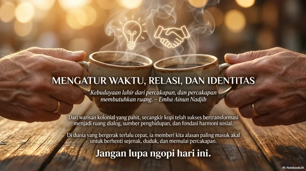 Tapi di luar semua angka statistik dan proyeksi bisnis sebagaimana diuraikan diatas, ada sesuatu yang lebih fundamental tentang hubungan orang Indonesia dengan kopi. Budayawan Emha Ainun Nadjib (Cak Nun) sering menggambarkan bahwa kebudayaan lahir dari percakapan, dan percakapan membutuhkan ruang. Di Indonesia, ruang itu sering kali bernama warung kopi. Kopi telah menjadi bagian dari identitas kita sebagai bangsa. Dari warisan kolonial yang pahit, ia bertransformasi menjadi ruang dialog, sumber penghidupan, dan simbol kebersamaan. Di meja-meja warkop dan kafe, lahir ide-ide bisnis, gerakan sosial, karya seni, hingga keputusan-keputusan penting dalam hidup seseorang.