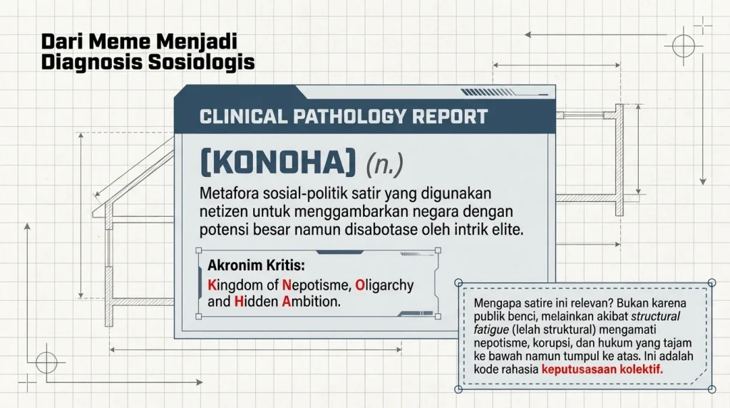 Halo, Sobat Kreator! Coba deh jujur, seberapa sering kamu buka TikTok, X (dulu Twitter), atau Instagram, terus nemu meme atau komentar sarkas yang bunyinya kira-kira begini: “Wkwkwk, yah namanya juga di negara Konoha,” atau “Pak Hokage ke-7 kita lagi sibuk ngapain nih?”. Kalau kamu sering banget liat atau bahkan ikut ngetik komentar macam itu, santai, kamu nggak usah merasa aneh dan asing. Istilah “Negara Konoha” udah jadi semacam kode rahasia netizen Indonesia buat ngebahas kondisi negeri ini dengan gaya satire yang khas dan udah bukan lagi monopoli candaan receh anak-anak wibu pencinta anime Naruto. Julukan ini udah bermutasi jadi bahasa satir level dewa, sebuah metafora sosial-politik yang dalem banget. Kenapa harus Konoha? Karena di dalam fiksi Naruto, Konoha itu desa yang isinya orang-orang hebat dan potensial, tapi di balik layar panggungnya dipenuhi intrik politik super kotor, nepotisme klan, korupsi elite, dan hukum yang tajem ke bawah tapi tumpul ke atas. Saking kreatifnya netizen kita, kata KONOHA bahkan dipelesetkan jadi akronim yang sadis tapi bikin ketawa getir: Kingdom of Nepotisme, Oligarchy and Hidden Ambition.