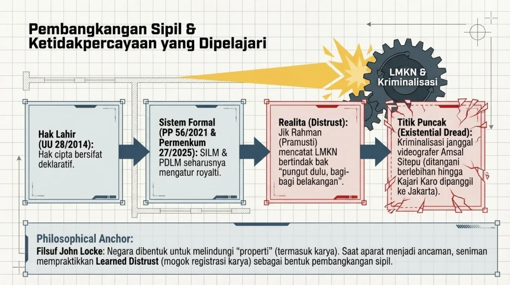 Jawabannya satu kata: Distrust (ketidakpercayaan). Ada perasaan bahwa LMKN ini seperti “super-operator” negara yang gayanya “pungut dulu, bagi-baginya belakangan”. Ini diperparah dengan meledaknya skandal hukum baru-baru ini yang menimpa Amsal Sitepu, seorang videografer profesional yang mendadak kena tuduhan korupsi saat lagi ngerjain project video biasa. Kriminalisasi pekerja kreatif yang dinilai super janggal ini sukses bikin seniman se-Indonesia marah, protes dan bahkan ada yang malah merinding ketakutan (existential dread). Saking ngawurnya, Komisi III DPR sampai harus jadi penjamin Amsal, dan Kepala Kejaksaan Negeri Karo akhirnya ditarik dan dipanggil ke Jakarta. Gaes, kalau kita inget pelajaran filsafat politik dari Om John Locke, dia bilang manusia mau bikin negara itu tujuan utamanya buat ngelindungin “properti” mereka, termasuk karya cipta dan hasil pikiran. Nah, ketika aparat negara malah jadi ancaman buat warganya sendiri, orang akan mempraktikkan apa yang disebut Learned Distrust (ketidakpercayaan yang dipelajari). Musisi-musisi kita melakukan pembangkangan sipil (civil disobedience); mereka punya KTP, tinggal di sini, tapi hatinya udah “lepas” dari negara. Mereka ngerasa, percuma diurus legalitasnya kalau ujung-ujungnya malah jadi sapi perah atau malah dikriminalisasi. Kekhawatiran yang cukup wajar sih saat sikonnya masih semrawut seperti kejadian diatas.