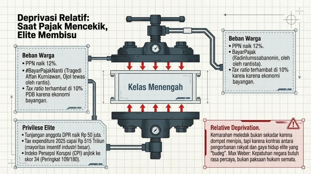 Yang bikin makin miris, angka belanja perpajakan (tax expenditure) tahun 2025 itu nyentuh Rp 515 triliun, tapi tebak lari ke mana? Mayoritas malah buat manjain industri-industri besar, bukan ke rakyat kecil. Padahal secara data, tax ratio (rasio penerimaan pajak) kita cuma di kisaran 10% dari PDB nominal, tapi tax gap (potensi yang ilang karena sektor bayangan/informal) masih sangat lebar. Artinya, yang dikejar-kejar terus ya kelas menengah yang udah taat pajak. Puncaknya meledak saat demonstrasi akhir 2025, di mana seorang driver ojol, Affan Kurniawan, tewas tertabrak kendaraan taktis aparat. Tragedi berdarah ini melahirkan tagar perlawanan #BayarPajakNanti. Meskipun kenyataan praktiknya boikot pajak itu susah (karena PPN nempel di berbagai barang minimarket), namun demikian, tagar itu adalah simbol hancurnya kepatuhan sukarela. Sosiolog Max Weber dulu pernah ngingetin: negara yang kuat itu butuh kepatuhan berbasis rasa percaya, bukan sekadar dipaksa. Kalau rakyat ngerasa dirampok secara legal demi lifestyle pejabat, jangan kaget kalau sentimen anti-pemerintah makin menebal, apalagi Indeks Persepsi Korupsi (CPI) kita melorot lagi ke skor 34 (peringkat 109 dari 180 negara).