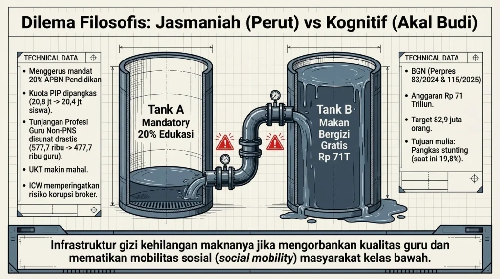 Lembaga macam Indonesia Corruption Watch (ICW) langsung teriak kalau ini tuh “tipu-tipu” pemenuhan APBN. Di sini ada dilema filosofis yang dalem: Negara pilih mana, “ngisi perut” (jasmaniah) atau “mencerdaskan akal budi” (kognitif)?. Buat apa anak dikasih nasi kotak gratis tiap siang kalau kualitas gurunya merosot karena demotivasi, dan pas dia mau kuliah malah nggak bisa karena bantuan PIP-nya dipotong dan Uang Kuliah Tunggal (UKT) makin gila-gilaan mahalnya?. Ini nutup harapan kelas bawah buat naik kelas (social mobility). Makanya, wajar publik parno dan curiga kalau program ini rawan banget dikorupsi broker lokal, apalagi kalau sampai ada kasus keracunan makanan.
