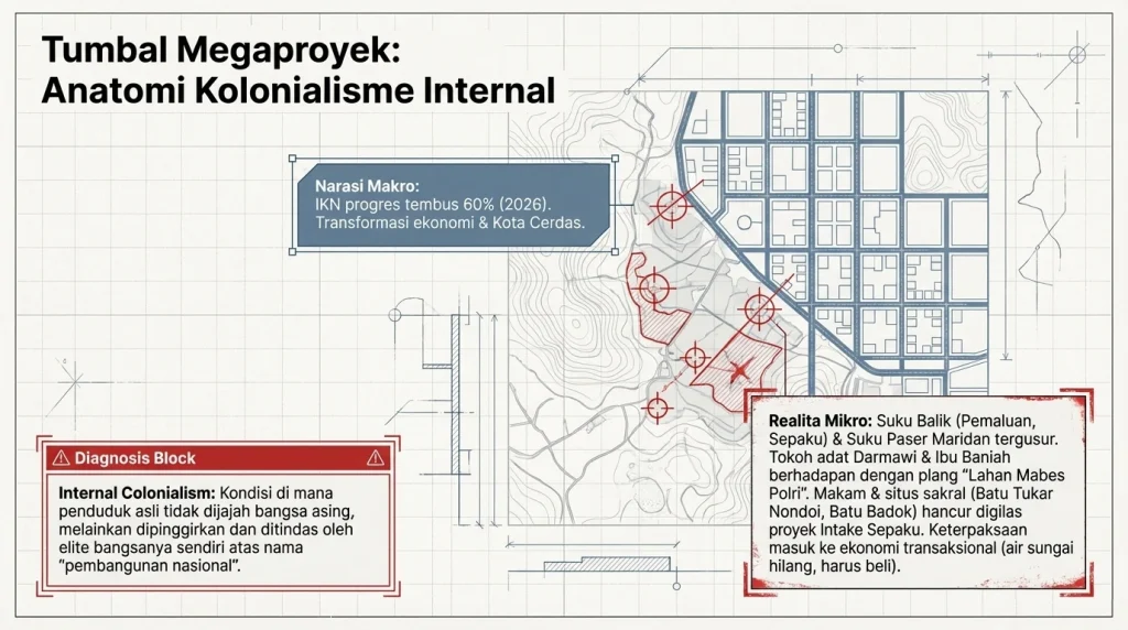 Mereka yang dulunya bisa hidup mandiri nyari makan di hutan dan sungai, sekarang dipaksa masuk ke ekonomi transaksional di mana air minum aja harus beli. Sosiolog punya istilah yang ngeri buat ini: Internal Colonialism (Kolonialisme Internal). Ini adalah kondisi di mana suatu bangsa nggak dijajah oleh asing, tapi penduduk aslinya dijajah, dipinggirkan, dan ditindas oleh elit bangsanya sendiri atas nama “pembangunan nasional”.