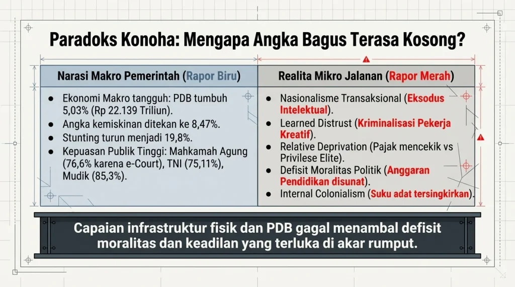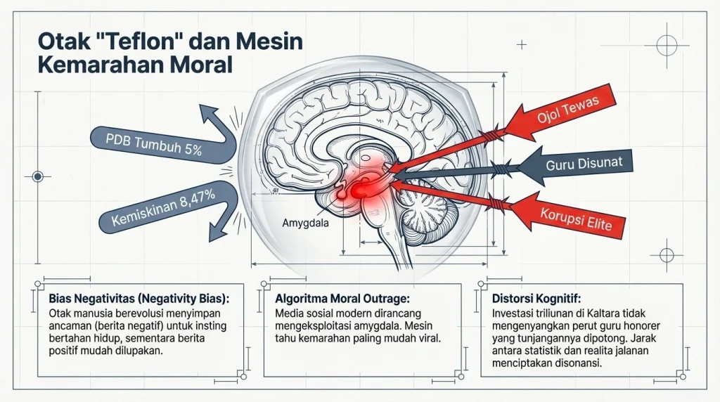 Nah, Ada sebuah fenomena yang namanya Negativity Bias (bias negativitas). Ibaratnya, otak manusia zaman purba itu berevolusi menyerupai Velcro (perekat kuat) buat nyimpen berita negatif, tapi menyerupai Teflon (panci licin anti lengket) buat nyimpen berita positif. Kenapa? Buat insting bertahan hidup. Saat kita denger info ojol mati ditabrak aparat atau musisi ditangkap, amygdala (pusat emosi di otak) kita langsung nyala terang benderang, jauh mengalahkan berita “PDB tumbuh 5 persen”. Ditambah lagi, algoritma medsos zaman now itu didesain dengan konsep Moral Outrage (kemarahan moral). Mesin tau kalau konten orang ngamuk itu gampang viral, di-like, dan di-retweet. Makanya, kita terus-terusan dijejali skandal demi skandal. Ada distorsi jarak yang jauh banget antara narasi statistik pemerintah dengan pengalaman nyata rakyat di jalanan. Makro ekonomi mungkin tumbuh, tapi dompet mikro rakyat tetap kempes. Pertumbuhan angka investasi puluhan triliun di Kaltara tidak lantas mengenyangkan perut seorang guru honorer yang tunjangannya disunat untuk program makan siang gratis (MBG). Masyarakat mengalami distorsi kognitif terhadap kebijakan pemerintah karena adanya jarak (gap) yang terlalu jauh antara narasi keberhasilan di media dengan rasa keadilan di jalanan. Kekecewaan psikologis masyarakat terjadi karena capaian infrastruktur fisik tidak mampu menambal defisit moralitas politik dan rasa keadilan yang terluka.