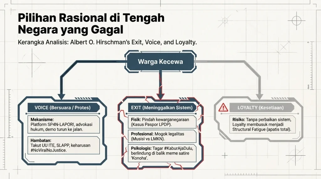 Exit ini bisa macam-macam bentuknya. Bisa exit beneran kayak cari paspor luar negeri (kasus alumni LPDP tadi). Bisa exit profesional kayak musisi yang ogah berurusan sama legalitas negara. Atau yang paling sering kita lakuin: exit psikologis. Kita cenderung jadi apatis, capek demo (structural fatigue), dan memilih berlindung di balik meme “Konoha” atau ngetwit tagar #KaburAjaDulu. Di sinilah tingkat Loyalty atau kesetiaan kita pada janji kemerdekaan mulai luntur.