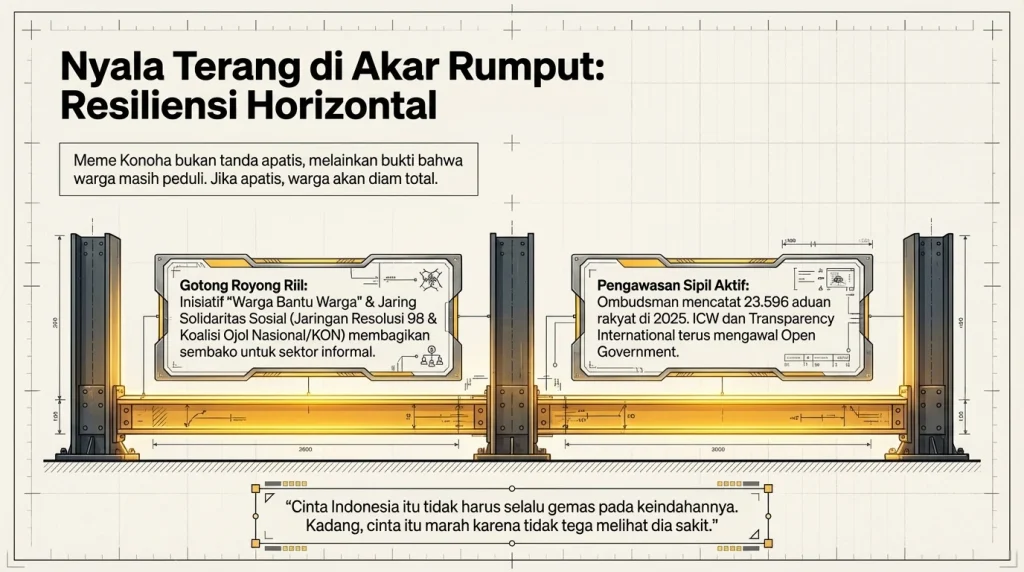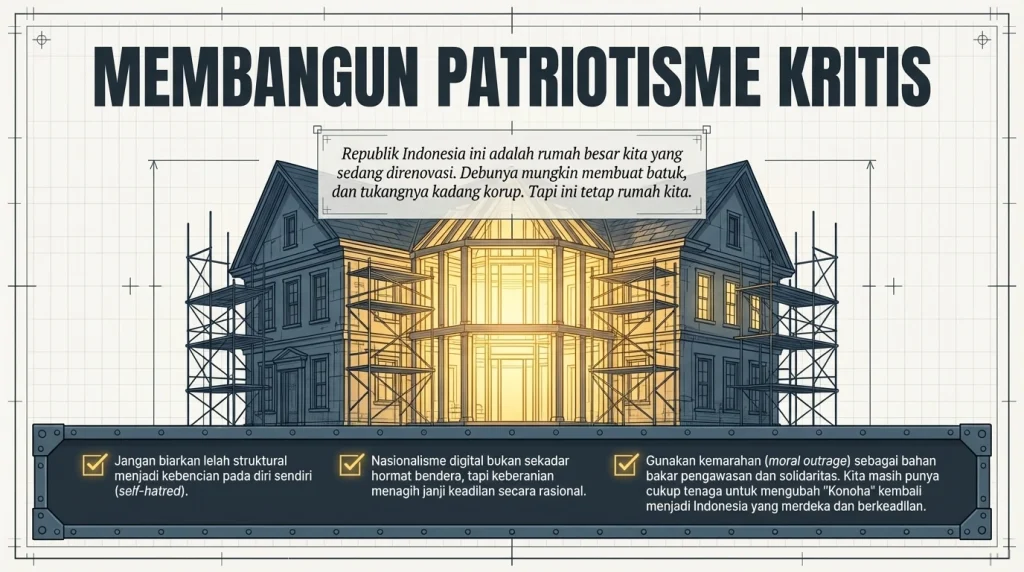 Coba liat gerakan “Warga Bantu Warga” atau inisiatif Jaring Solidaritas Sosial yang digagas sama aktivis Jaringan Resolusi 98 dan Koalisi Ojol Nasional (KON). Mereka urunan bagi-bagi sembako buat sektor informal yang kejepit himpitan ekonomi. Ini bukti gotong royong Pancasila itu riil ada di jalanan, nggak cuma di buku PPKn sekolahan. Lembaga sipil kayak Ombudsman terus kerja keras nampung 23.596 aduan rakyat di 2025. ICW dan Transparency International terus advokasi Open Government supaya anggaran publik diaudit. Secara filosofis, meme Konoha itu justru bukti otentik kalau kita belum apatis sepenuhnya. Orang nggak bakal repot-repot bikin pelesetan satir, bikin thread panjang di X, atau ngomel di kolom komentar kalau mereka udah bodo amat. Seperti kata pepatah yang relevan banget: “Cinta Indonesia itu nggak harus selalu gemes sama keindahannya. Kadang, cinta itu marah karena nggak tega lihat dia sakit”. Nasionalisme di era digital bukan lagi sekadar hormat bendera pas 17-an; tapi keberanian untuk mempertanyakan negara demi menagih janji keadilan. Inilah yang disebut dengan Patriotisme Kritis.