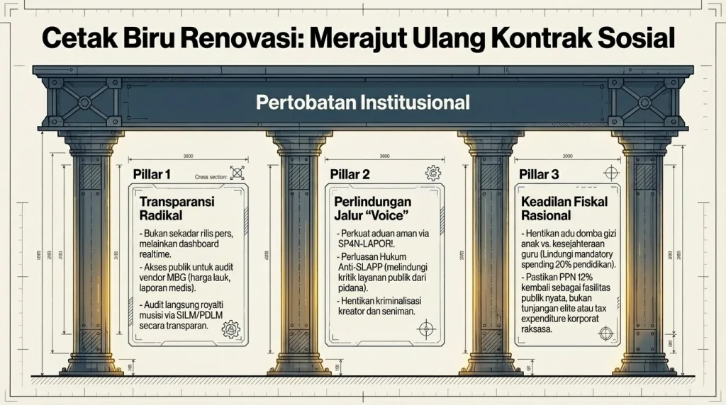 1. Transparansi yang Radikal: Bukan cuma rilis pers dari menteri, tapi bikin dashboard realtime. Rakyat harus bisa akses data siapa vendor program Makan Bergizi Gratis (MBG), berapa harga lauknya, dan laporan keracunannya. Begitu juga buat royalti musisi (Sistem SILM/PDLM); musisi harus bisa audit laporannya langsung.